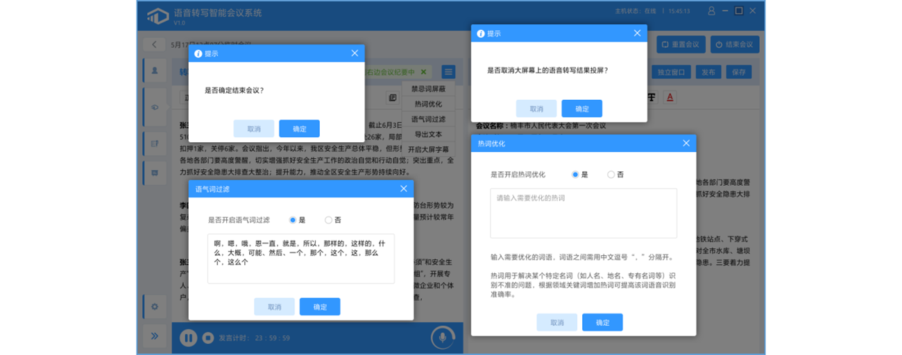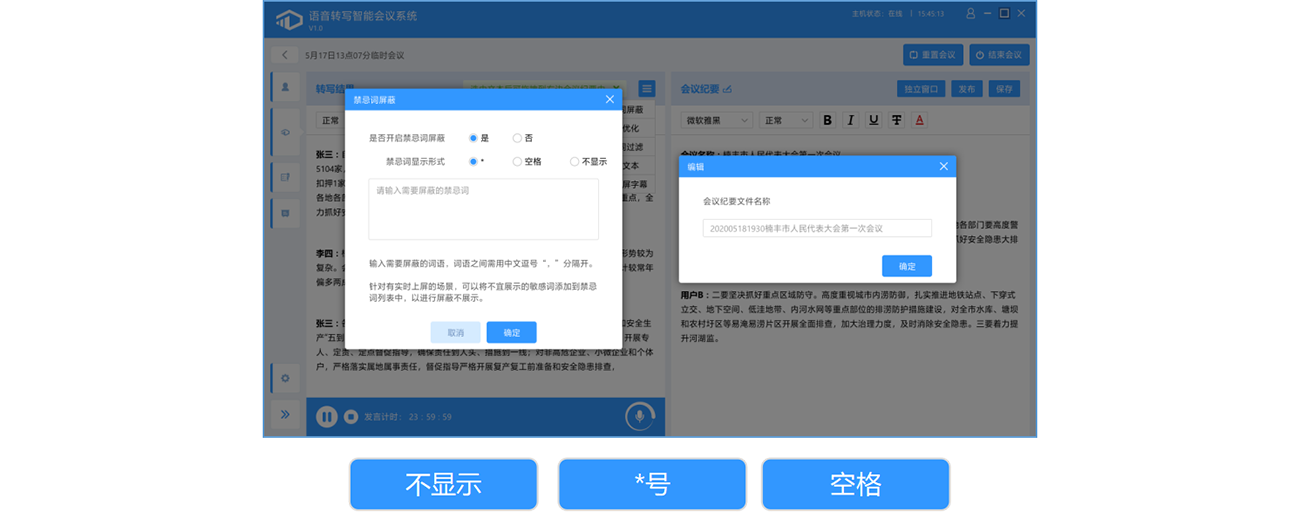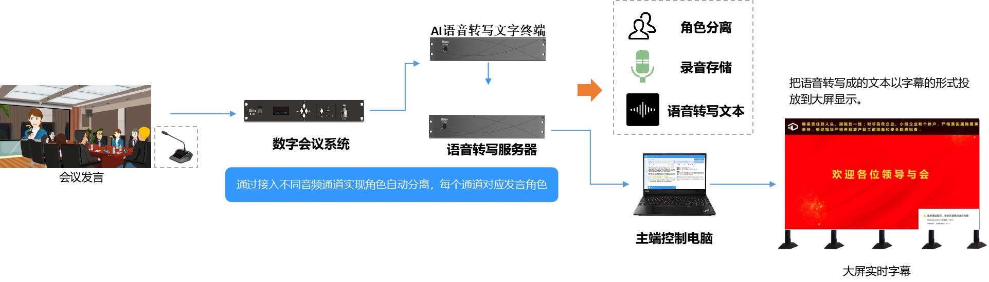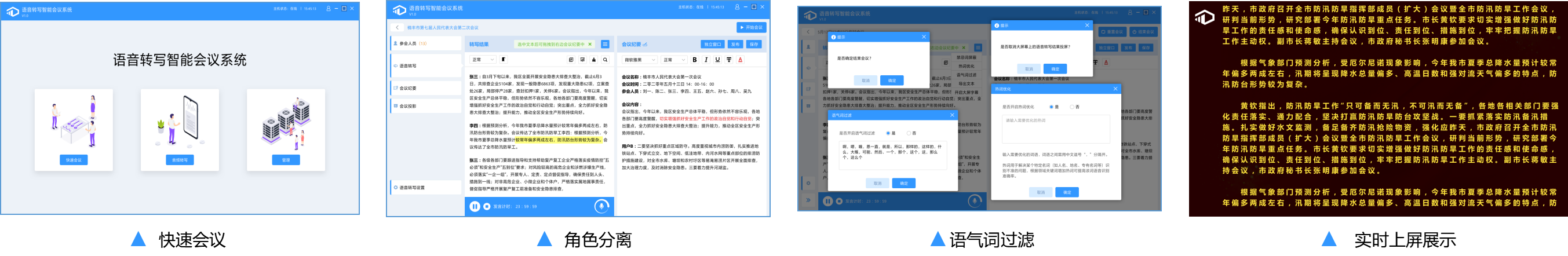 角色分离:实现在会议过程中对会议的发起方、参与方、主席、主持人、秘书等将各方发言的内容进行角色分离并自动实时识别成文字,并把语音转写成的文本以字幕的形式投放到大屏显示。