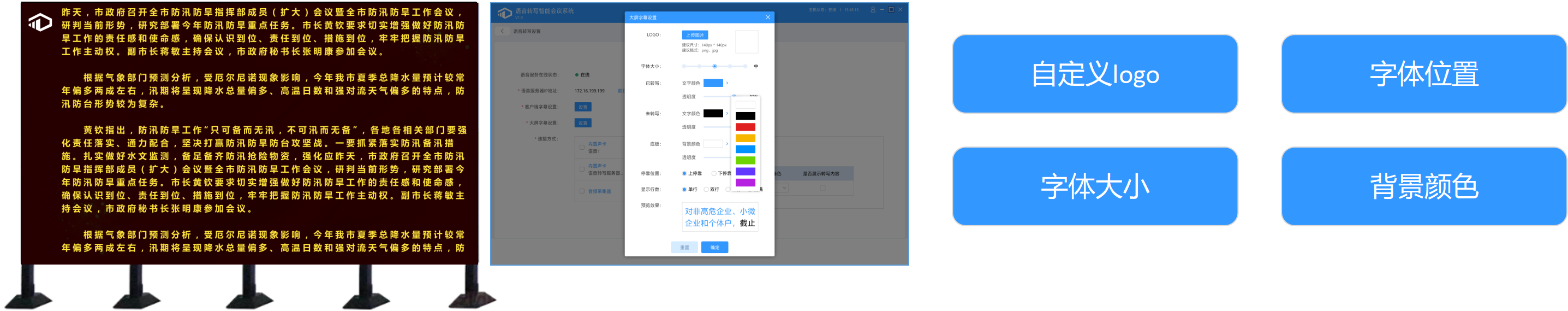 展板展示转写结果:语音转写展板展示语音转写文本内容,可对展板字体进行放大缩小和重点标记。自动同步展板纪要内容,实时展示语音转写文本。